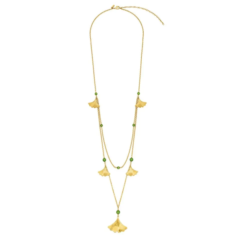 Réinterprété en bijoux, de délicates perles de cristal brillant vert Antinéa se déposent sur des feuilles de Ginkgo en Laiton plaqué or jaune 18 carats, ondulées et finement ciselées.