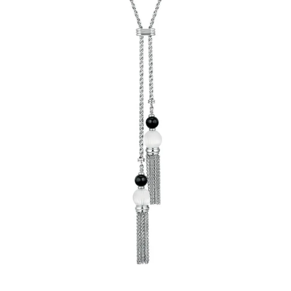 Collier sautoir en cristal incolore et noir, pompon de chaînes en argent. Un collier très personnel et original signé Lalique. Découvrir la collection Vibrante Lalique.