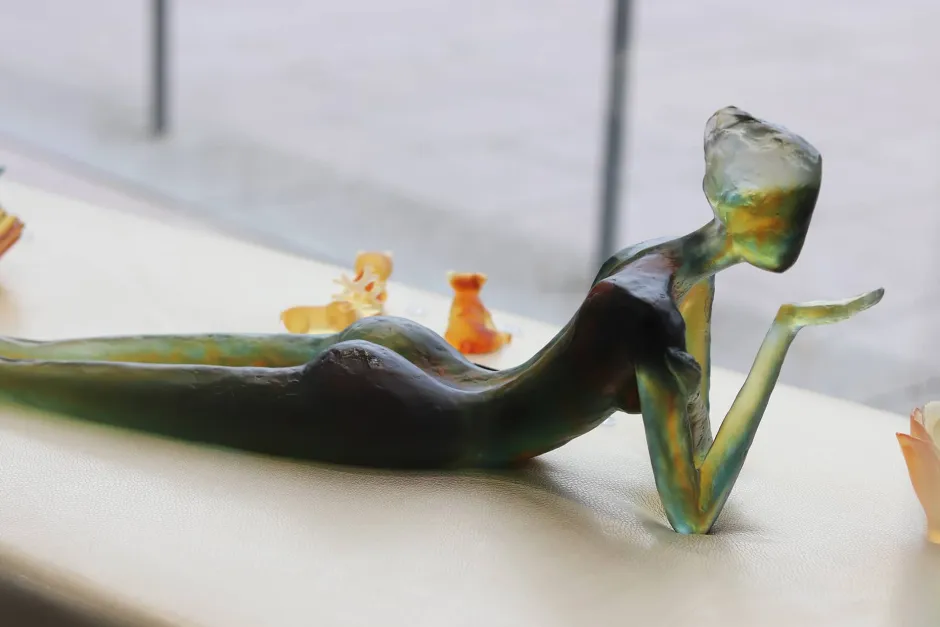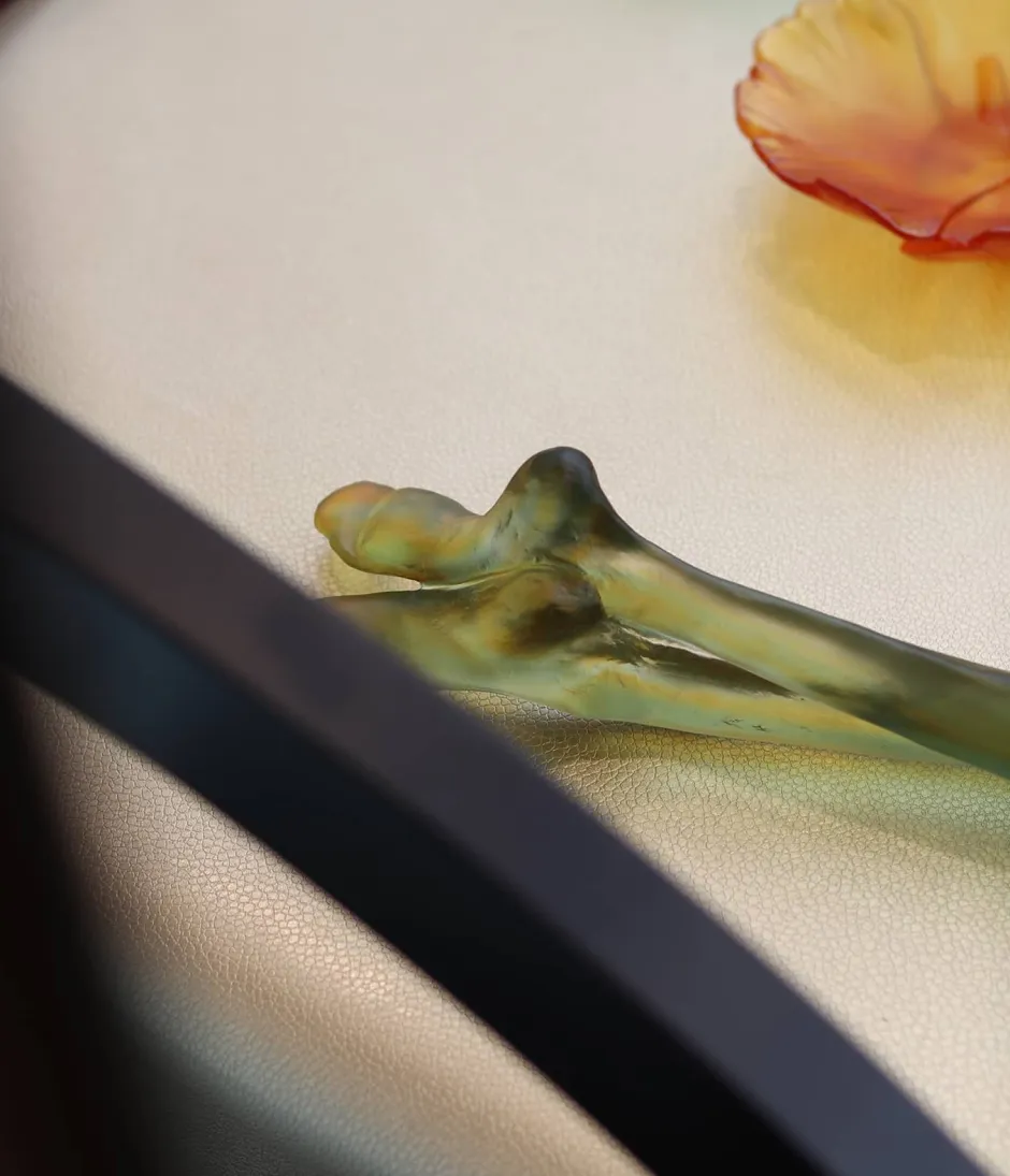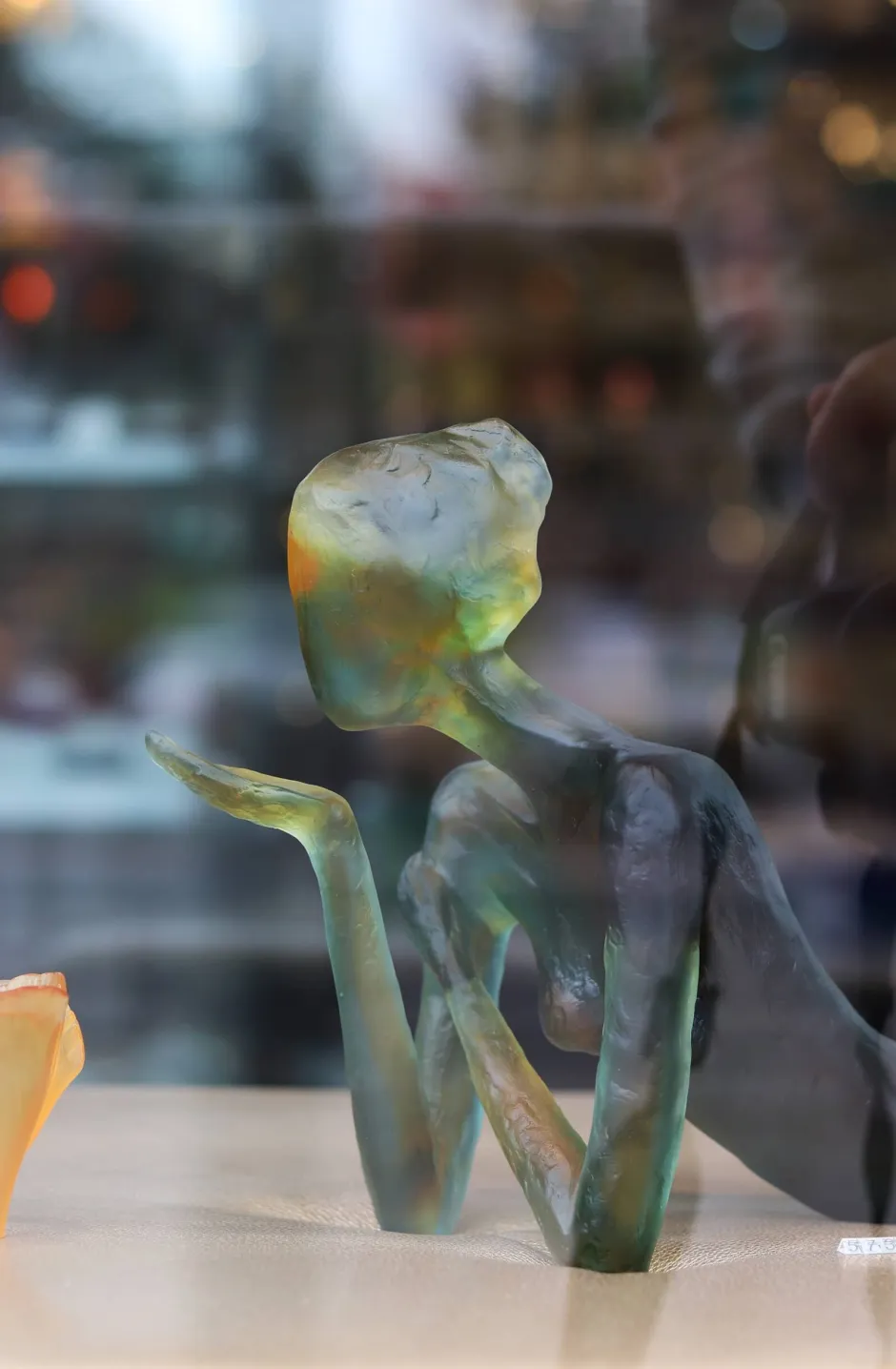 Daum célèbre une nouvelle fois la femme à travers Darling, dont émane une grande élégance avec ses lignes élancées et ses subtiles nuances de vert, gris et ambre. Les sculptures de Sylvie Mangaud, comme Darling, c’est aussi une disproportion volontaire qui rend l’ensemble harmonieux avec des jambes qui s’étirent à l’infini, alliant longueurs des lignes et douceurs des courbes. Les visages restent lisses, laissant les corps parler, délicatement sensuels mais jamais impudiques.