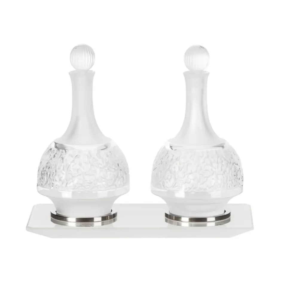 Illuminée par le cristal satiné repoli, une frise de feuilles de vignes et grappes de raisins parcourt chaque flacon, couronné d’un bouchon sculpté de stries. Ce décor est directement inspiré de celui du vase éponyme, créé par René Lalique en 1939. Façonné dans le cristal le plus pur, cet ensemble allie esthétique et fonctionnalité pour les tables d’exception.