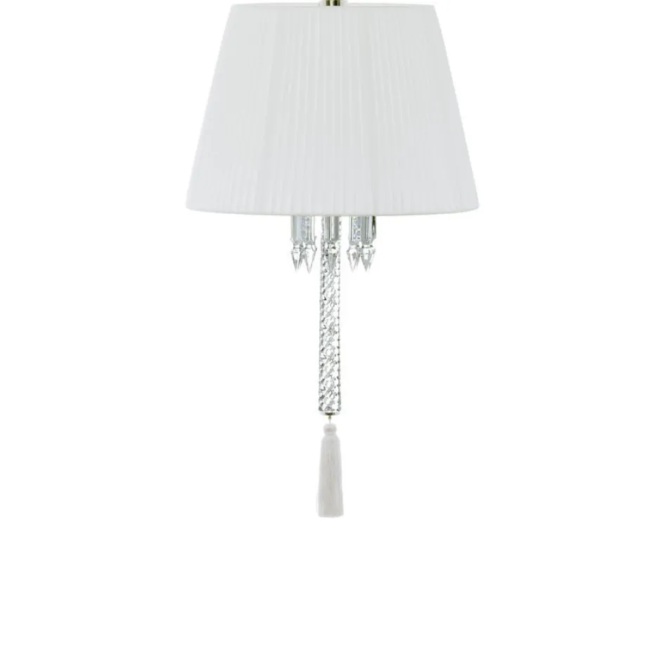 De la note d’humour de l’abat-jour en taffetas noir plissé, positionné à l’envers, le regard glisse vers le miroitement discret mais superbe des pendentifs cristal clair puis vers une passementerie (noir, blanc ou rouge) qui termine la silhouette.