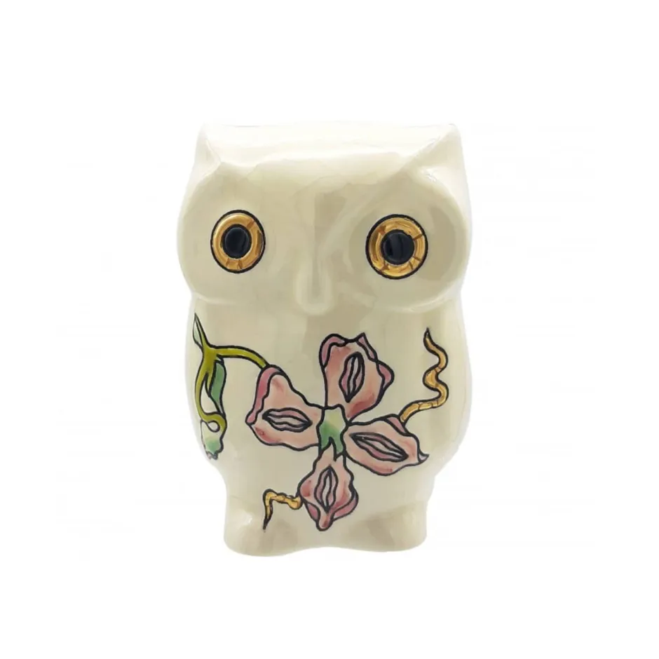 Notre petite chouette se décline en « Hommage à Gallé » avec ses motifs floraux roses et verts sur fond ivoire.