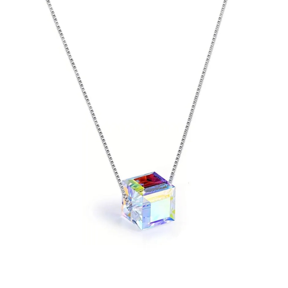 Ce pendentif reflète la lumière grâce à la clarté du cristal, associée à un jeu de couleurs iridescent.