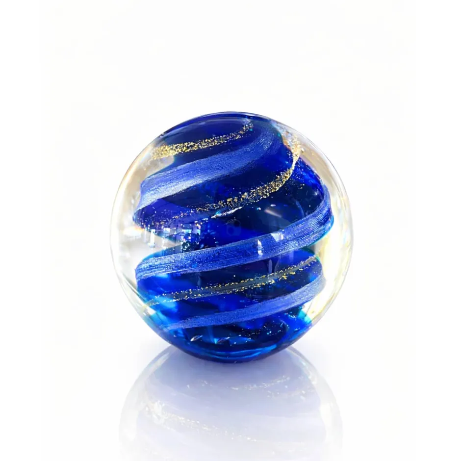 Au cœur de cette sphère se dévoile un scintillement envoûtant de vagues bleues aux reflets dorés.