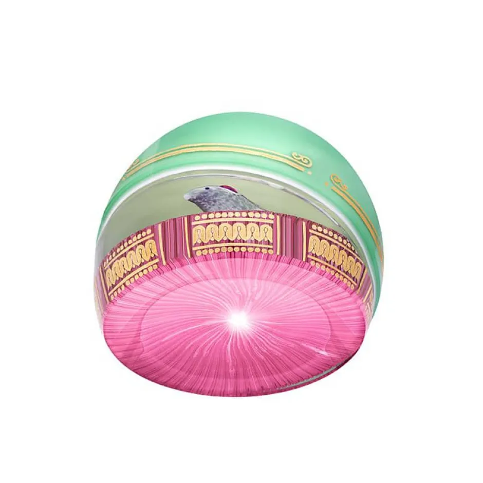 Le rat, que la ruse et la malice distinguent parmi les animaux du zodiaque asiatique, se cache sous un bol. La délicatesse de son corps, réalisé à la main au chalumeau, est magnifiée par la taille du dessus à travers laquelle on l’aperçoit. Il repose sur un parterre de millefiori formant une multitude de losanges aux tons pastels représentant des friandises. Dans sa gourmandise il s’est glissé sous un bol, dessiné par une calotte en émail blanc doublé de cristal vert évoquant les céramiques céladon. La réalisation d’un pontil de biais et d’une taille en biseaux dessinant les traits du bol achève de faire de ce presse-papiers une pièce alliant technique et poésie, que l’on ne tarde pas à soulever pour enfin débusquer l’animal malicieux s’y cachant.
