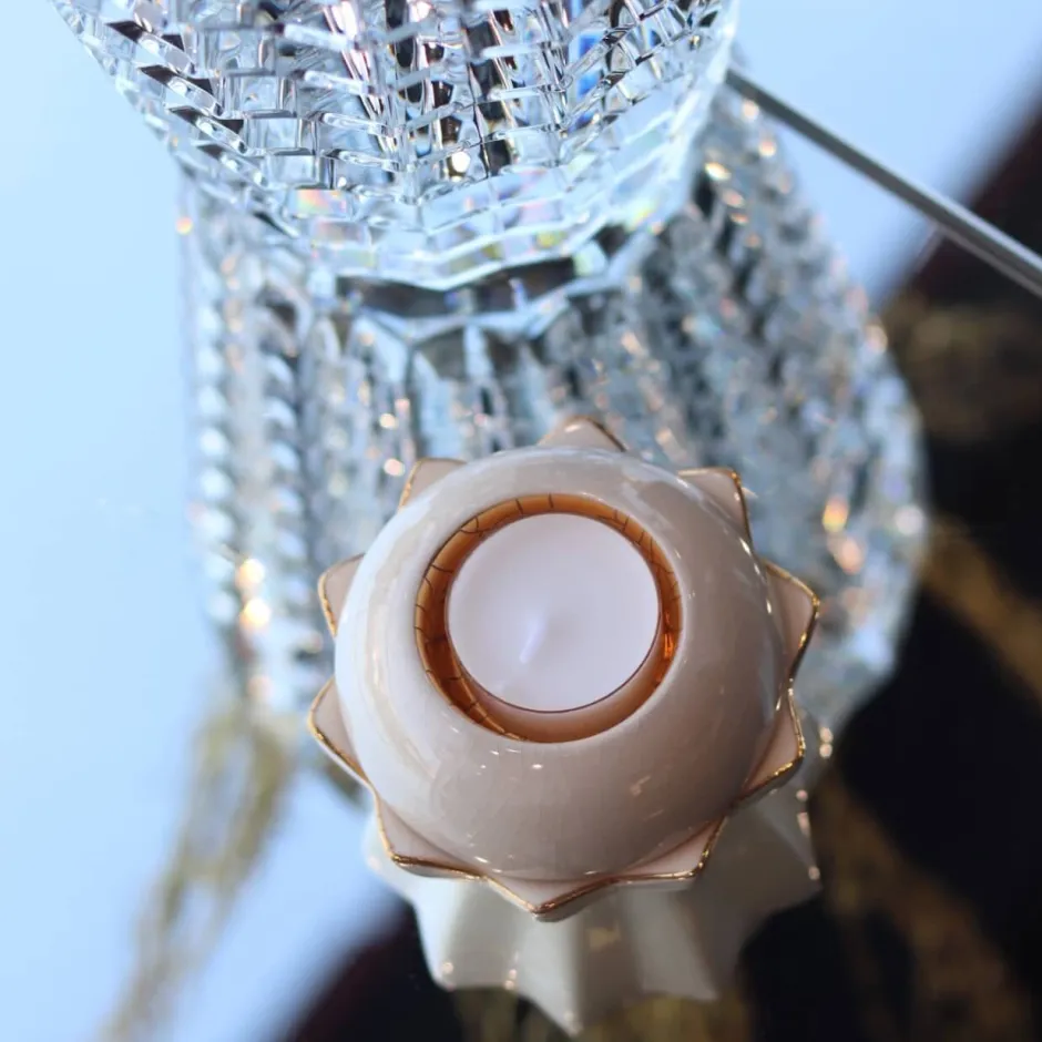 Évoquant la pureté du lotus, ce bougeoir délicat se compose d’un socle immaculé aux contours soulignés d’or, surmonté d’une coupole aux teintes douces, ivoire, vert d’eau ou rose. Chaque intérieur est sublimé d’un éclat d’or 24 carats, symbole de lumière et de renouveau. Élégance et spiritualité s’entrelacent dans cette création raffinée.