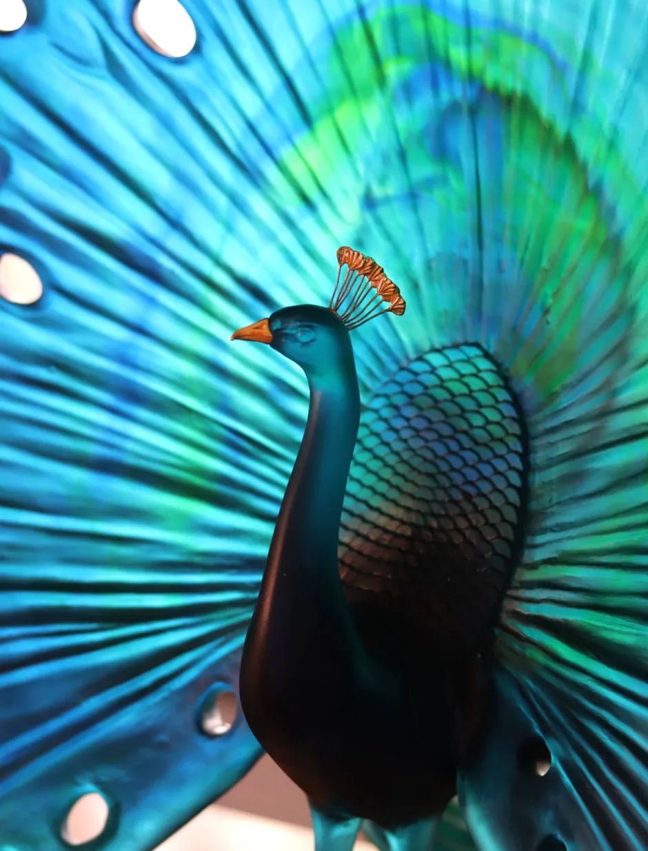 Le Paon et son plumage spectaculaire sont un thème cher à l’artiste. Avec cette nouvelle sculpture, Madeleine van der Knoop immortalise l’extraordinaire roue du Paon, un des plus beaux spectacles de la nature. Le cristal Daum révèle les couleurs sublimes des plumes du paon, le jeu de lumière met en valeur les magnifiques nuances de verts et de bleus de cette parade majestueuse. Son bec et aigrette dorés subliment les délicates particularités du paon.