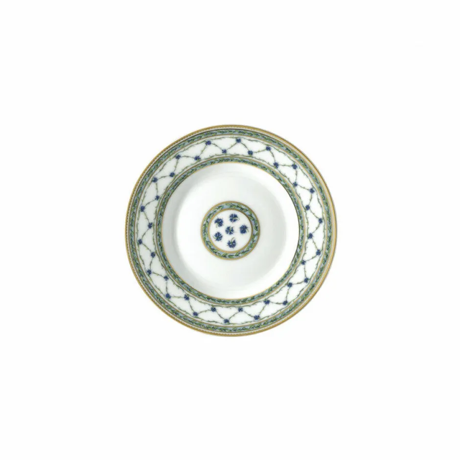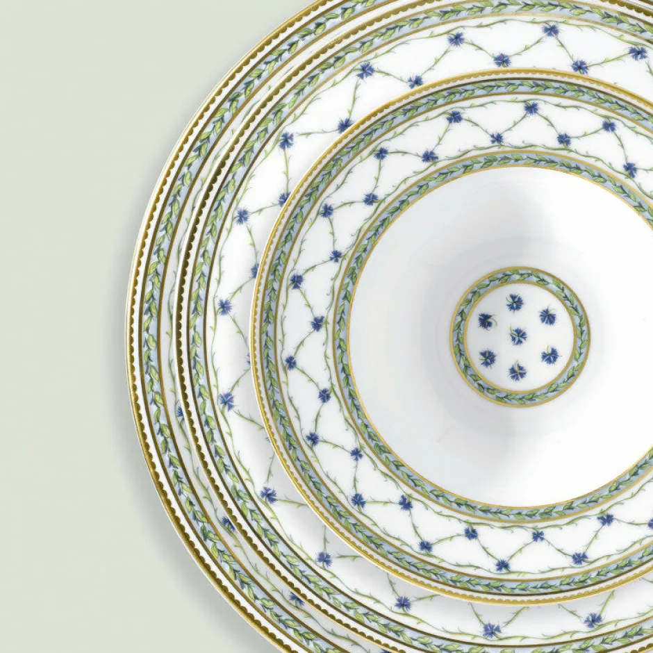 Compacte et précieuse, cette assiette plate de 22 cm conjugue élégance historique et raffinement contemporain. Parée du somptueux décor végétal de la collection Allée du Roy, elle déploie en bordure un croisillon orné de délicats barbeaux bleus et de feuillages stylisés, ponctué de lauriers et de filets d’or finement appliqués à la main. Son format est idéal pour les entrées, petites compositions ou desserts servis avec distinction.