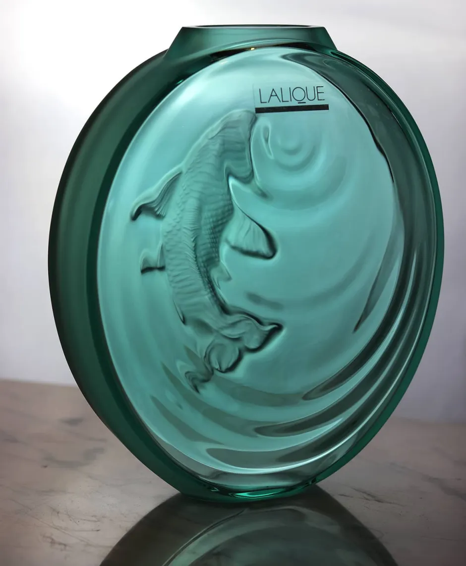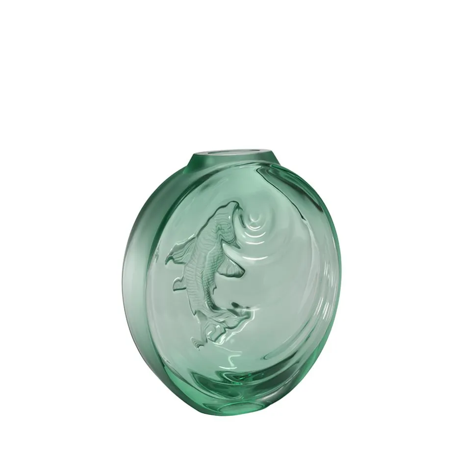 A travers le mouvement de l’onde animant la face avant du vase, une carpe Koï, sculptée en intaille sur la face arrière, semble remonter à la surface de ce lac de cristal. Répondant à la géométrie des lignes, la pureté du cristal incolore, vert menthe ou bleu Persépolis, délivre ici toute sa lumière.