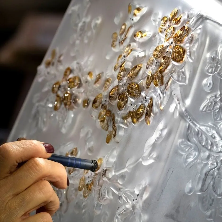 La forme anguleuse complique la bonne répartition du cristal, ce qui nécessite une grande maîtrise technique. Le verrier doit également être vigilant à la bonne impression du décor. Ce vase présente un cristal satiné par bains de matage pour obtenir cette finition Lalique. Les pétales des fleurs sont tamponnées d’or liquide très pur appliqué à la main ainsi que les nombreux points d’émail, noir et blanc. Cette opération demande plus de trois heures de travail. Chaque vase est ensuite recuit une nuit à 510°C.