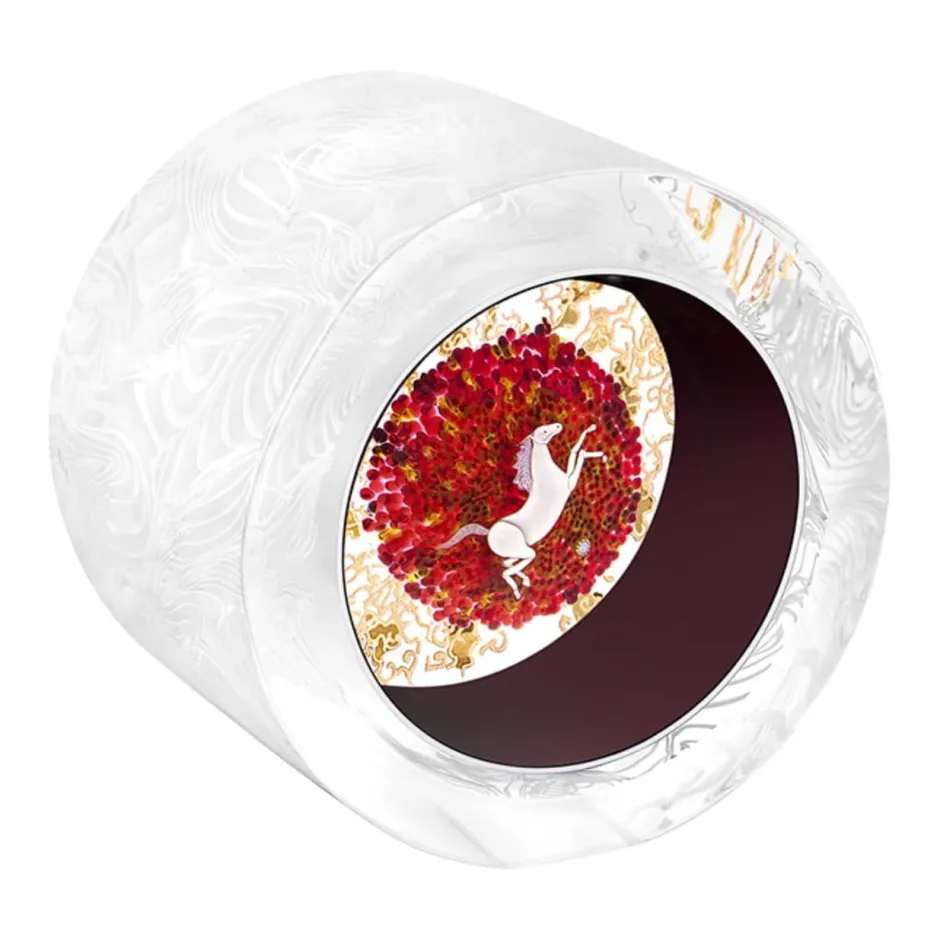 Le presse-papier est ainsi décoré d’arabesques dansantes et animées, en écho à la force et l’énergie du cheval de feu qu’il concentre en son sein. Le tout est enfin recouvert d’une couche plus épaisse de cristal clair.