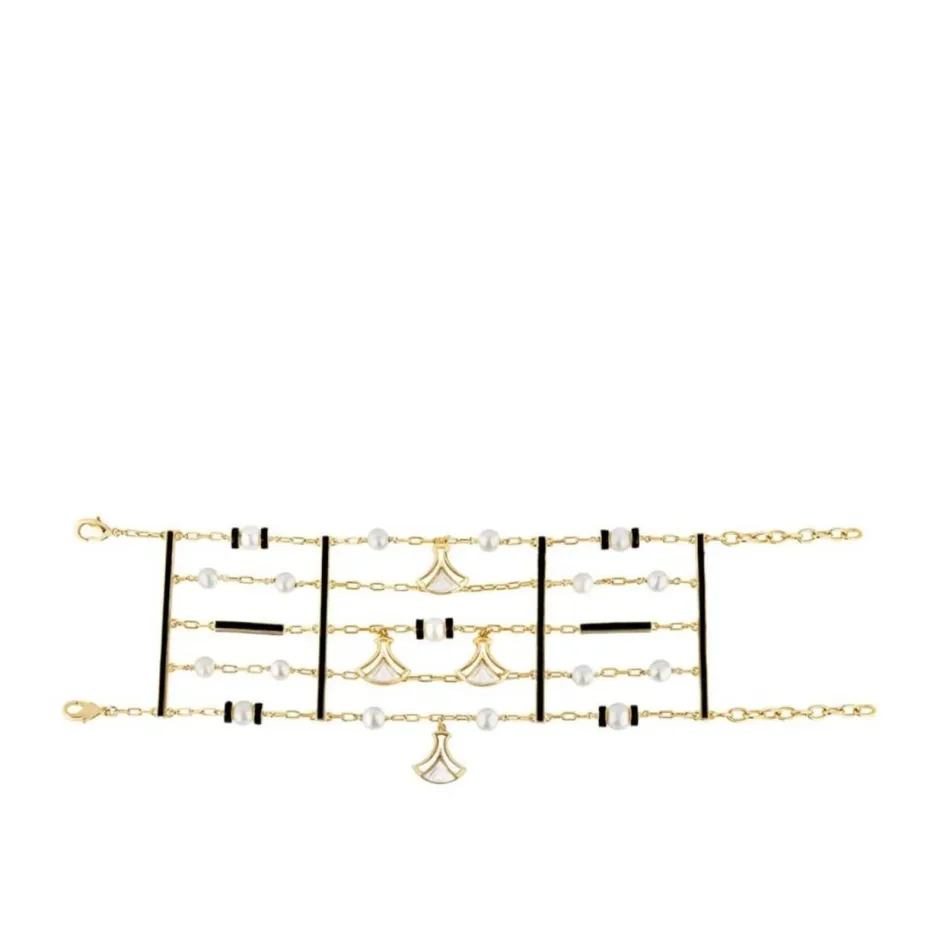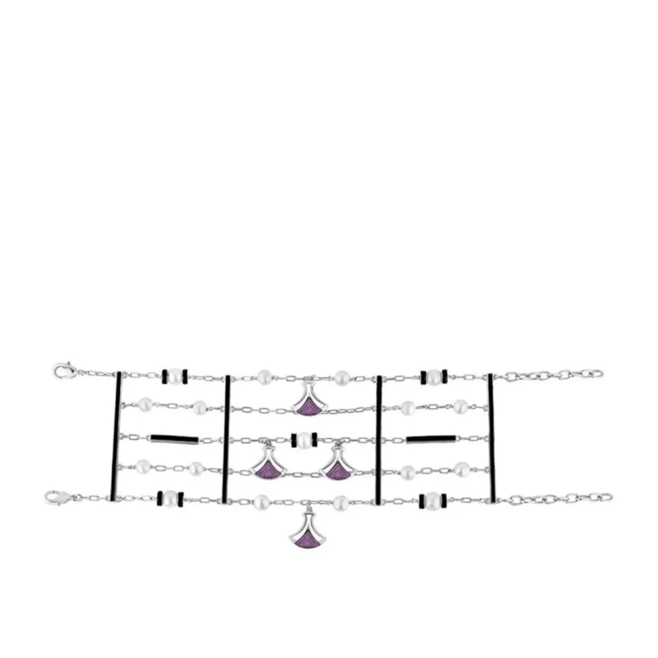 Les cristaux subtilement sculptés de stries sont montés en pampille sur les 5 rangs de chaînes de cette manchette, en alternance avec de délicates perles. La silhouette géométrique de sa monture ajourée rappelle des structures architecturales en arcade mêlant métal et verre. L’intemporel cristal incolore paré d’or lumineux, ou l’argent serti d’un cristal violet crépuscule, sont soulignés d’une fine bande de laque noire dans l’inspiration Art déco.