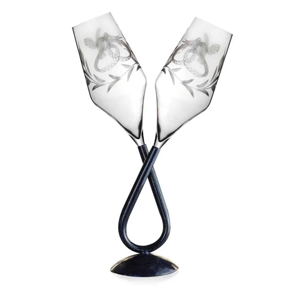 Ce duo de flûtes à champagne est une ode à votre amour : deux colombes, symboles de bonheur et de paix, s’associent à l’anneau de votre union.