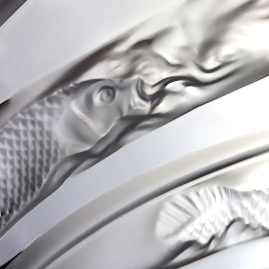 Très prisées en Asie, les carpes Koï représentent la richesse, la virilité, la longévité et la persévérance. Ce symbolisme prend notamment sa source dans une légende chinoise : après avoir remonté le Fleuve Jaune à contre-courant et réussi à passer la cascade du Dragon, une carpe courageuse se serait envolée vers le ciel en se transformant en dragon. La carpe est ainsi devenue un symbole de la réussite à travers la persévérance et cette légende reste aujourd’hui célébrée lors des Koinobori, pour souhaiter aux jeunes enfants la réussite scolaire et le succès social. Ce vase Carpes Koï illustre avec majesté cette légende ancestrale à travers douze carpes affrontant le courant d’un tourbillon de cristal satiné et repoli.