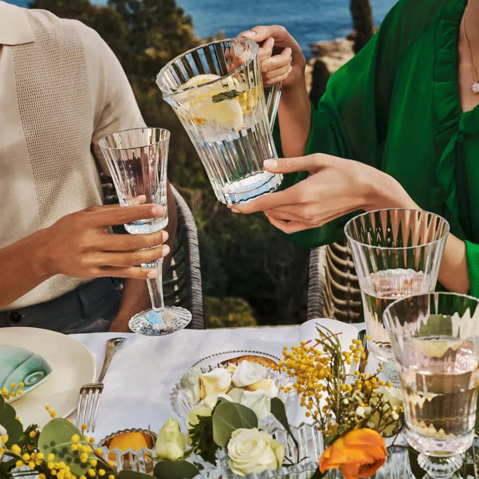 Expression unique d’un Orient revisité, la collection Mille Nuits créée par Mathias évoque la splendeur des palais des Mille et Une Nuits. Les côtes vénitiennes taillées sur la carafe démultiplient les jeux de lumière et fera briller votre table. Complétez votre décoration avec les verres et autres accessoires de la collection.