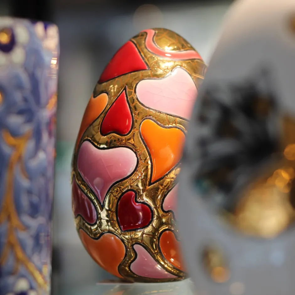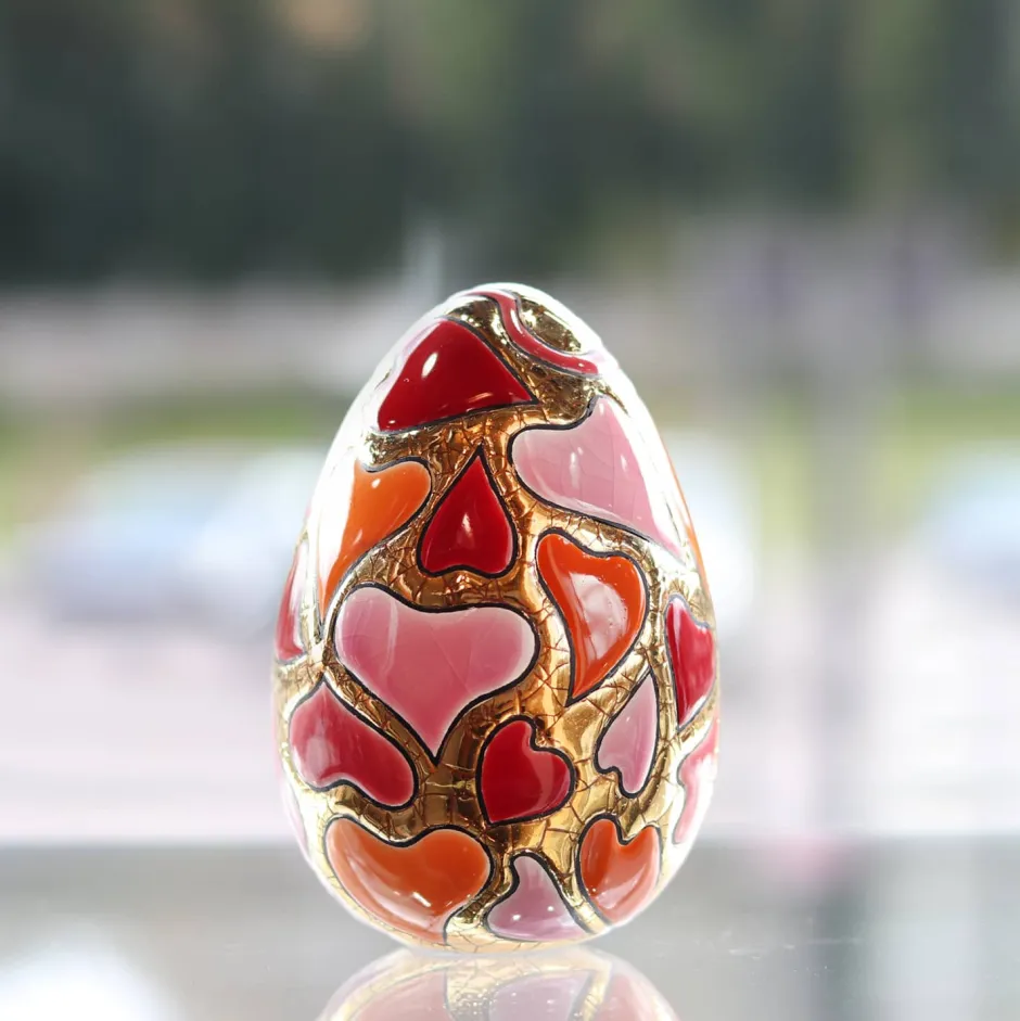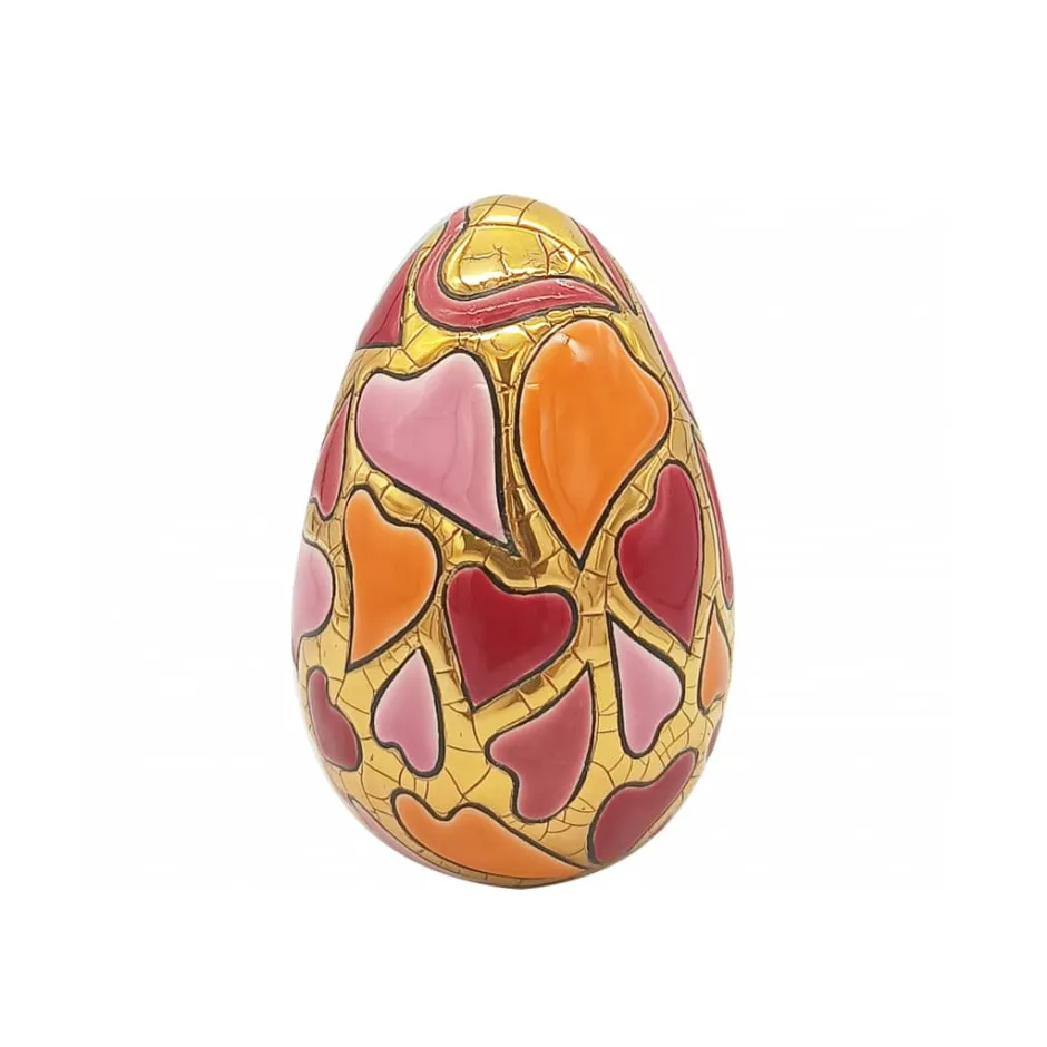 Pour célébrer toutes les mamans, Catherine Lhoir a créé un oeuf taille 2, plein de tendresse. Du rouge, du rose, de l’orange… Autant de couleurs pour lui représenter tout votre amour. Et de l’or fin 24 ct pour lui rappeler à quel point elle est délicate et précieuse.