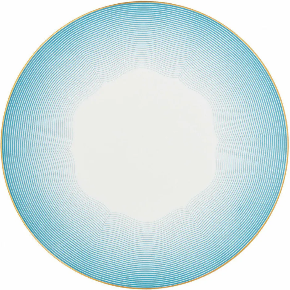 Sublimez vos tables avec l’assiette plate Aura de Raynaud, une pièce d’exception en porcelaine de Limoges. Son décor graphique, inspiré des modèles festonnés du XVIIIᵉ siècle, révèle une composition de traits bleus intenses qui s’affinent vers le centre, dessinant des courbes légères et aériennes.