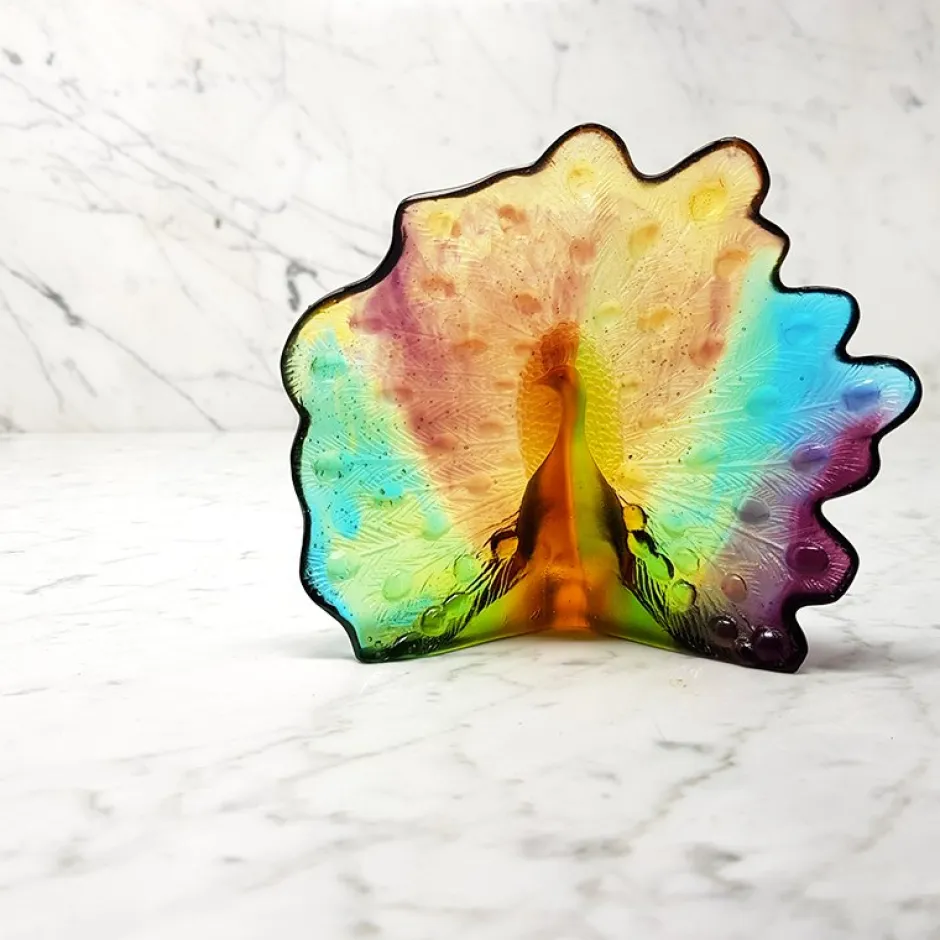 Le paon en pâte de cristal Daum représente à merveille cet oiseau originaire d’Inde, qui séduit les femelles en arborant son imposant plumage.