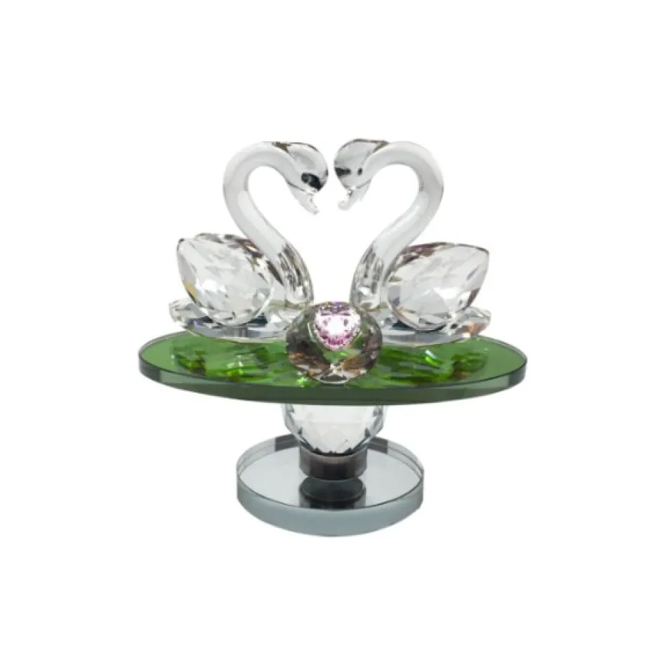 Duo de cygne en cristal, accompagné de son coeur rose, sur miroir tournant. Le symbole parfait de l’amour, un cadeau précieux à offrir à l’être aimé !