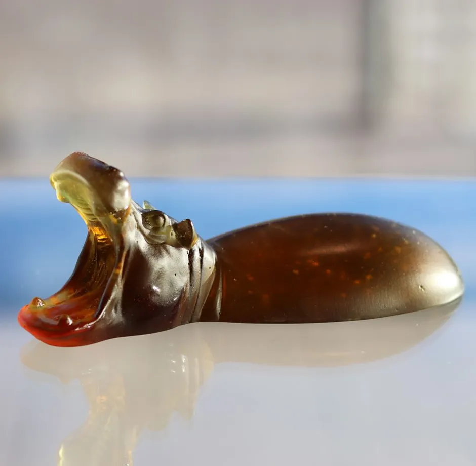 Hippopotame en pâte de cristal, de la collection Daum. L’hippopotame ambre imerge de l’eau, pour en faire un presse-papier.
