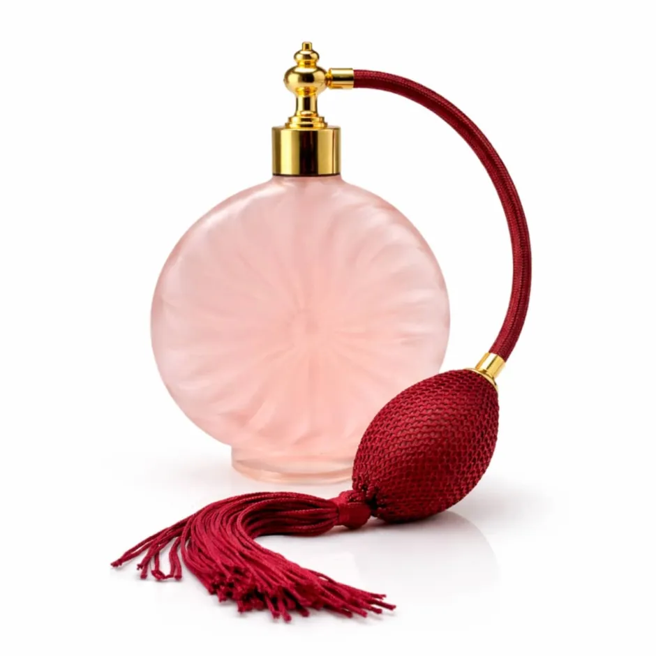 Tel un médaillon de verre délicatement travaillé, Rosée Impériale dévoile une teinte poudrée aux accents de lumière. Sa silhouette ronde, subtilement satinée, évoque la grâce des coiffeuses parisiennes d’autrefois. La monture dorée, éclatante de noblesse, s’unit à une pompe poire textile rouge profond pour un geste empreint de raffinement.