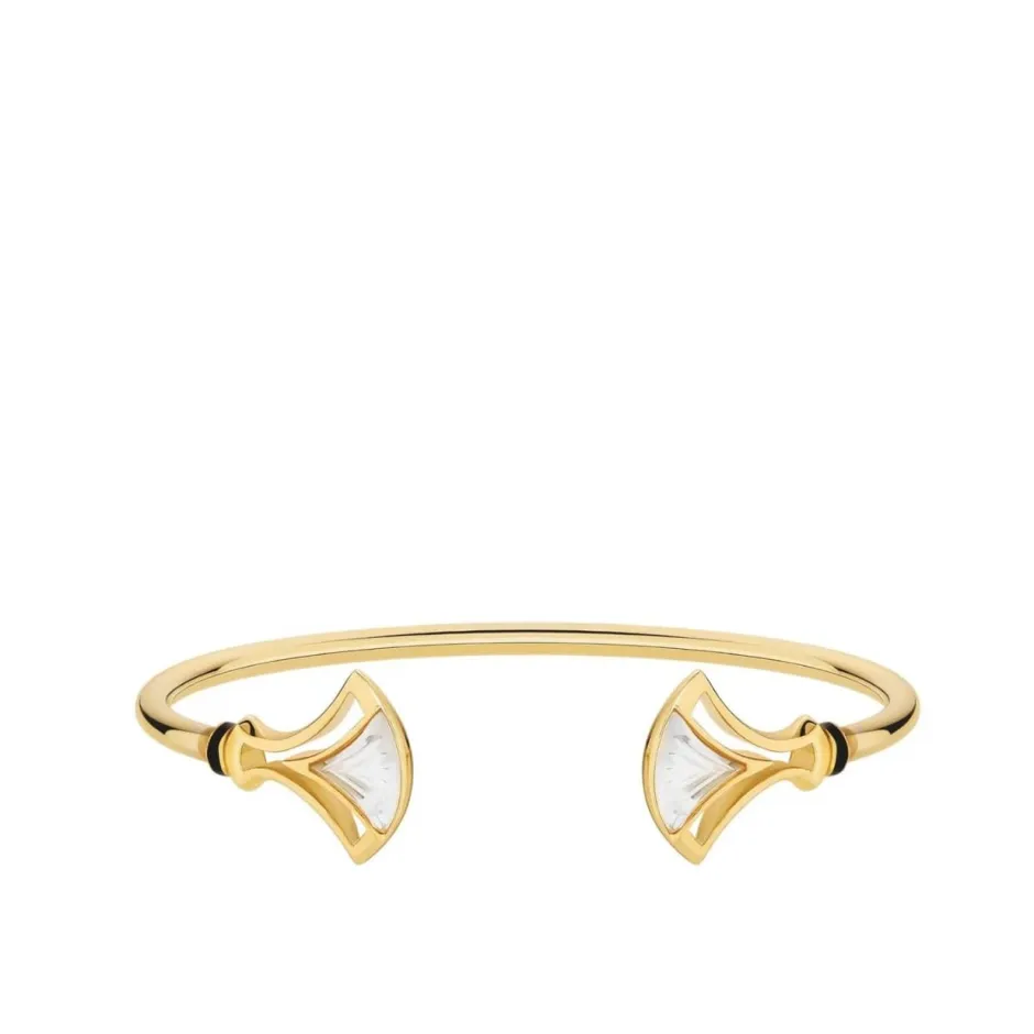 Un duo de cristaux subtilement sculptés de stries fait rayonner ce bracelet flexible. La silhouette géométrique de sa monture ajourée rappelle des structures architecturales en arcade mêlant métal et verre. L’intemporel cristal incolore paré d’or lumineux, ou l’argent serti d’un cristal violet crépuscule, sont soulignés d’une fine bande de laque noire dans l’inspiration Art déco.