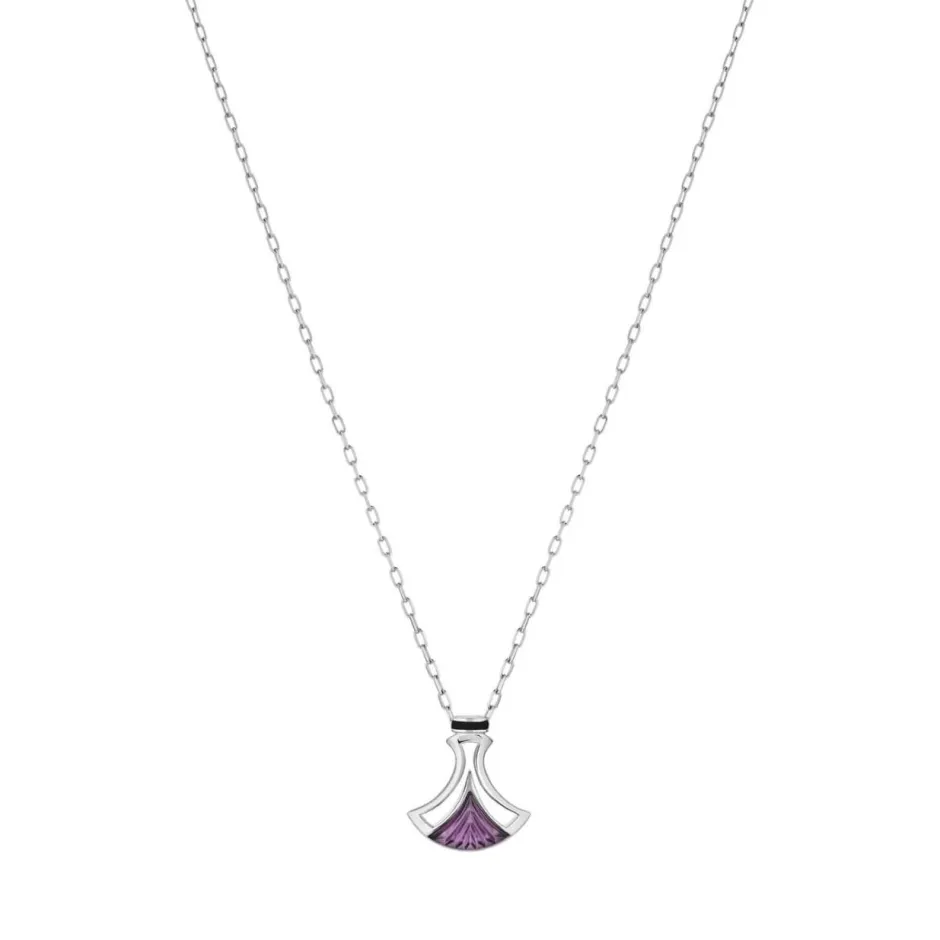 Le cristal subtilement sculpté de stries fait rayonner ce délicat collier. La silhouette géométrique de sa monture ajourée rappelle des structures architecturales en arcade mêlant métal et verre. L’intemporel cristal incolore paré d’or lumineux, ou l’argent serti d’un cristal violet crépuscule, sont soulignés d’une fine bande de laque noire dans l’inspiration Art déco.