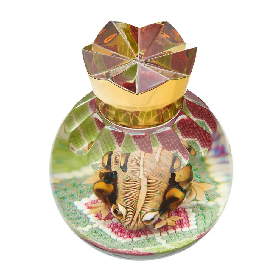 Prince pour les occidentaux, symbole de prospérité et annonciateur du temps, au sens météorologique pour l’orient, le crapaud est un animal riche de sens dans le monde entier. Réalisé au chalumeau, le très réaliste crapaud est posé en apesanteur sur un parterre de millefiori tel un jardin à la française. Le presse-papiers est surmonté d’une couronne taillée à même la boule de cristal et dorée à l’or fin 24 carats.