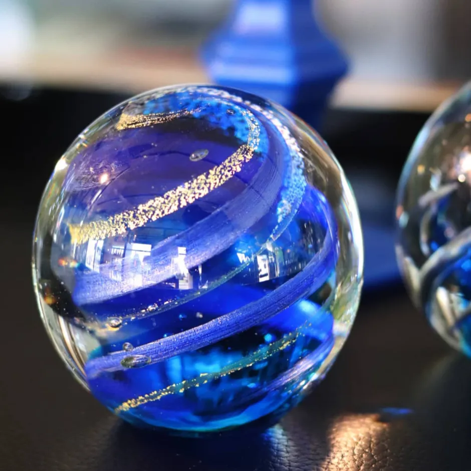 Au cœur de cette sphère se dévoile un scintillement envoûtant de vagues bleues aux reflets dorés.