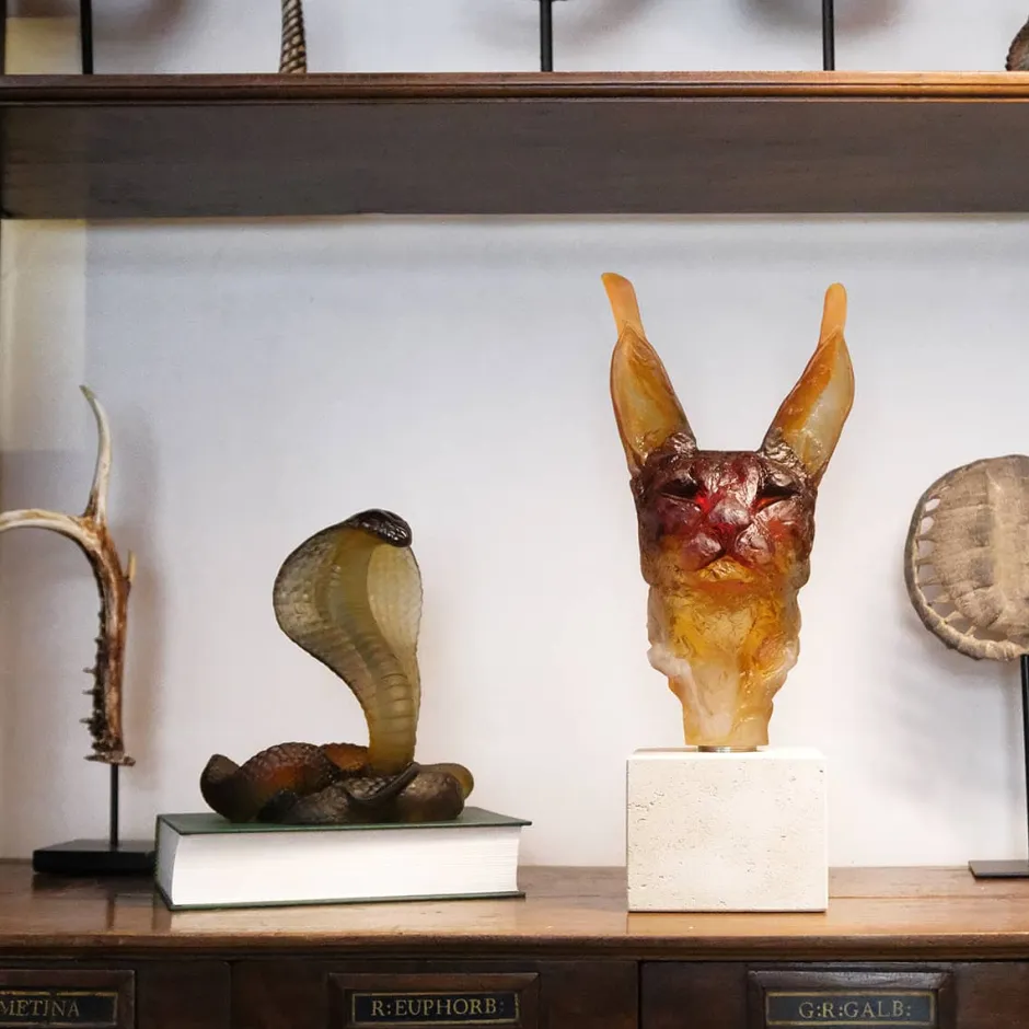 Reconnaissable par ses longues oreilles élancées, il est capable de grands sauts et de grimper aux arbres. La transparence du cristal et ses jeux de texture minutieusement élaborés laissent paraître son naturel imprévisible.