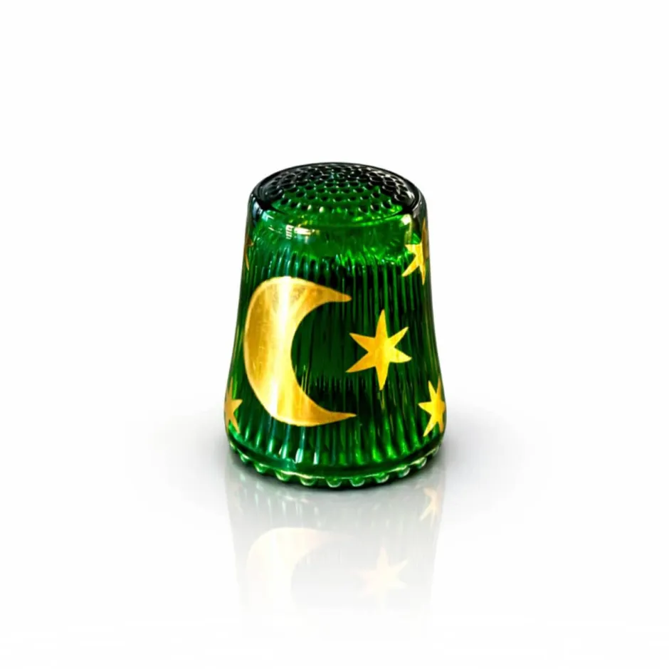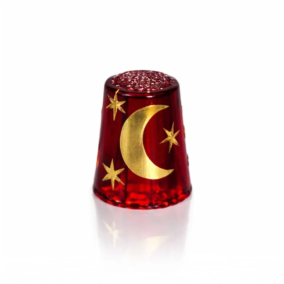 Découvrez le Dé à Coudre en cristal doré à l’or : la lune y est représentée d’un côté, tandis que le soleil vibrant y est apposé de l’autre.