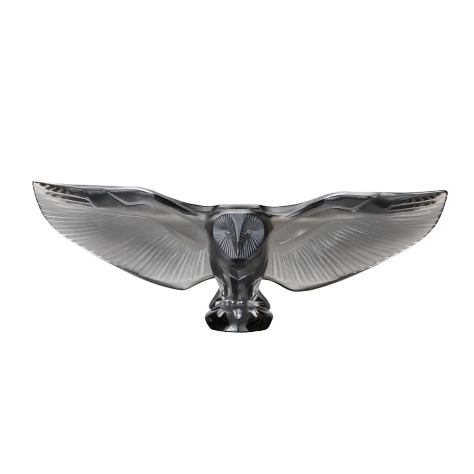 C’est le moment crucial avant l’attaque que Lalique a piégé dans le cristal. Les serres grandes ouvertes, la chouette effraie fend l’air. En vol, ce rapace est si silencieux que ses proies se laissent facilement prendre.