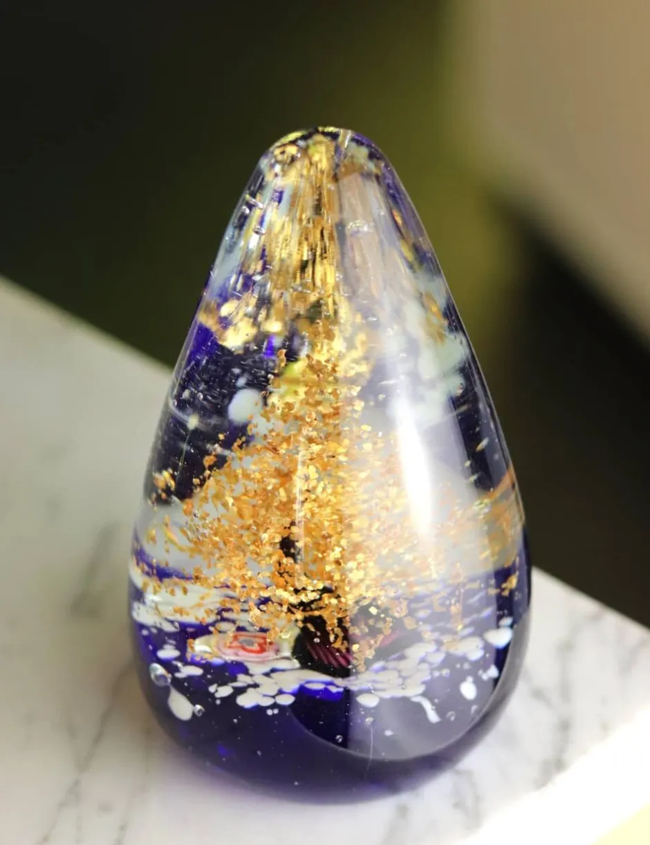 Monolithe s’élève comme une relique d’un monde ancien, capturant en son cœur une pluie d’or en suspension. Soufflé bouche, il marie la pureté du cristal à l’éclat métallique, entre mystique et majesté.