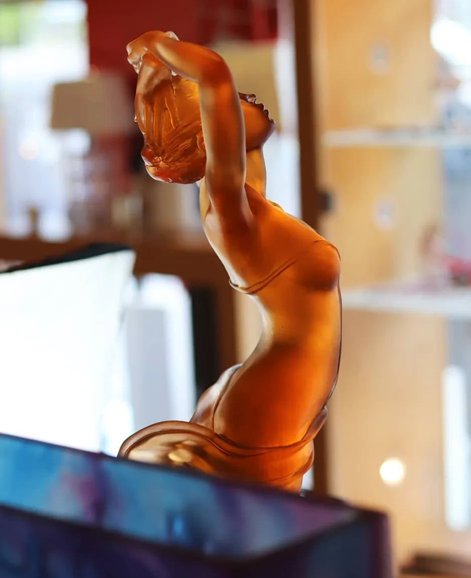 « A Cœur Battant » célèbre la féminité, source d’inspiration inépuisable pour Marie- Paule Deville Chabrolle et la Maison Daum. Daum cristallise le mouvement délicat et dynamique de la danseuse, dont émane grâce et émotion. La sensualité de l’œuvre est sublimée par la transparence, les couleurs subtiles et le rendu soyeux de la pâte de cristal Daum.