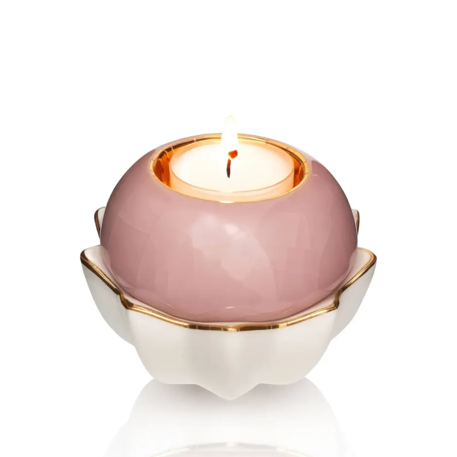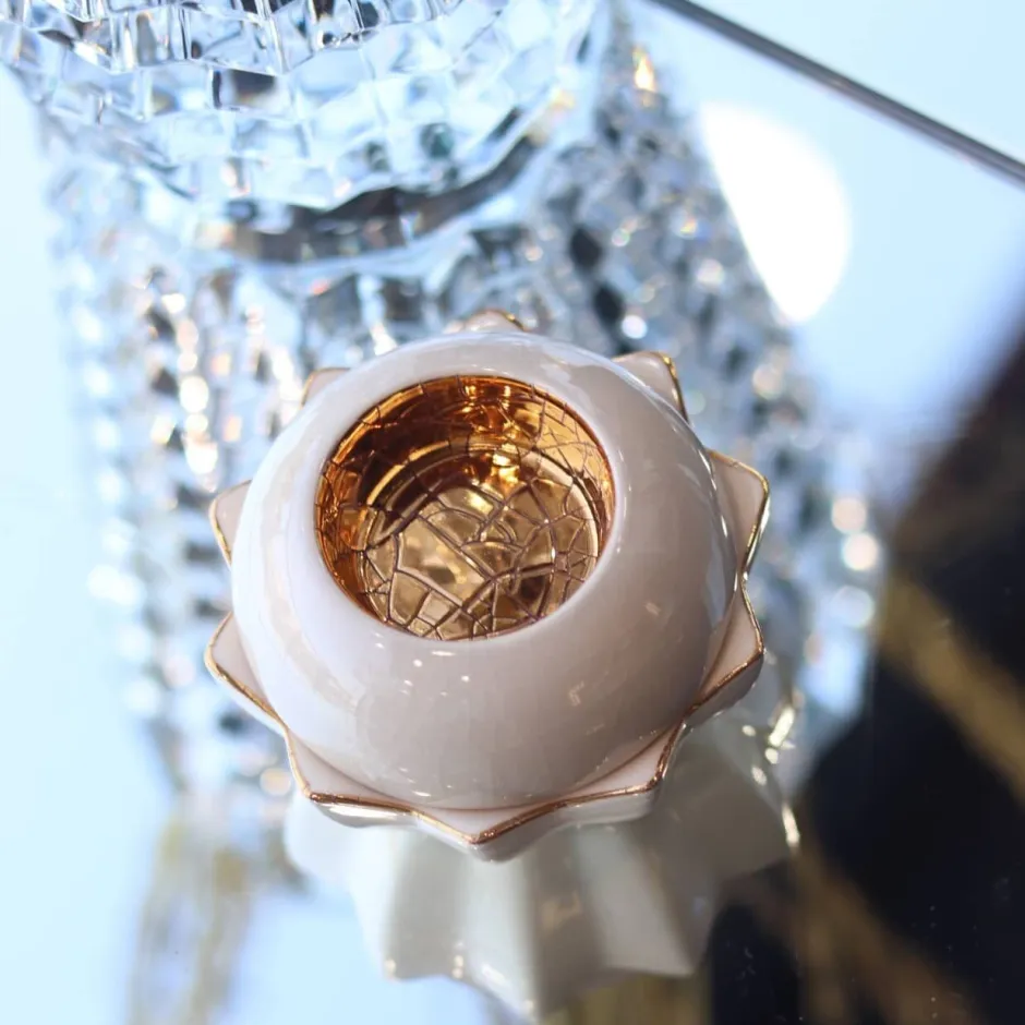 Évoquant la pureté du lotus, ce bougeoir délicat se compose d’un socle immaculé aux contours soulignés d’or, surmonté d’une coupole aux teintes douces, ivoire, vert d’eau ou rose. Chaque intérieur est sublimé d’un éclat d’or 24 carats, symbole de lumière et de renouveau. Élégance et spiritualité s’entrelacent dans cette création raffinée.