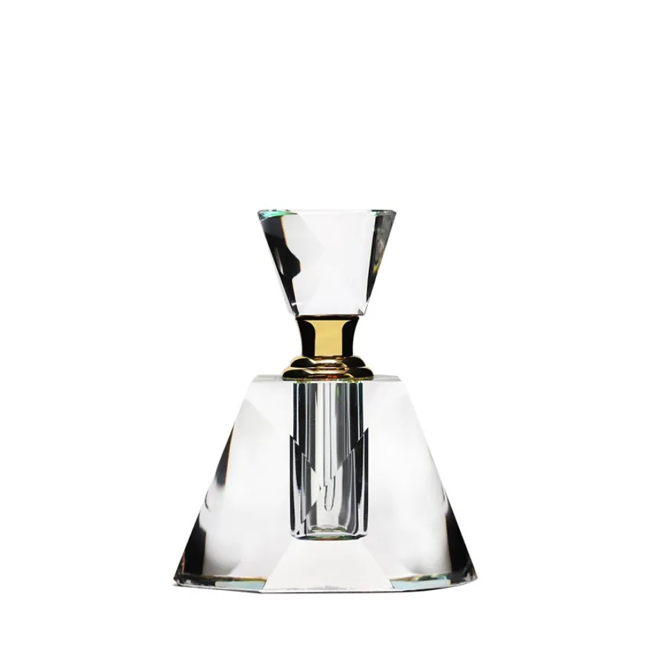 Subtil et délicat, ce flacon en cristal aux formes géométriques est sublimé par une taille du cristal nette et précise. Réalisé entièrement en cristal clair, on y découvre des effets de couleurs variant suivant la position du flacon. Une feutrine noire placée sous le flacon donne ces reflets multicolores au cristal. Insérez quelques gouttes de votre meilleur parfum à l’intérieur, une tige en cristal vous permet de déposer cette subtile fragrance sur les endroits souhaités.