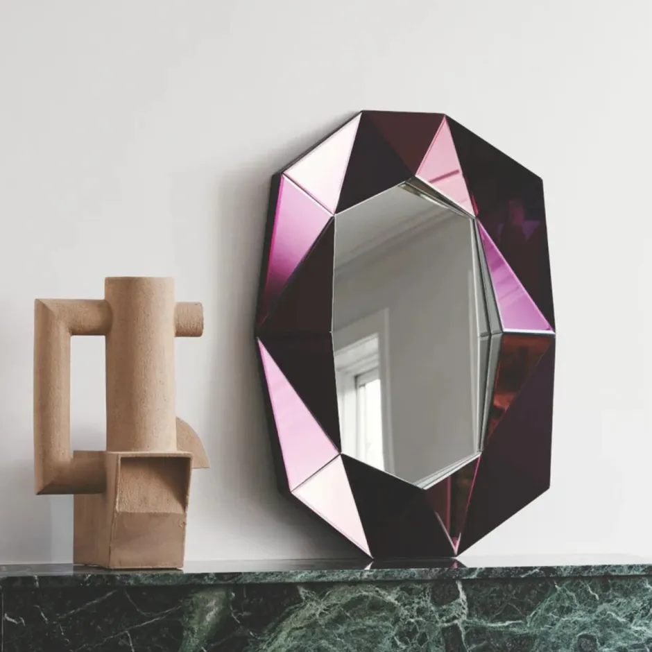 Ce petit miroir diamant bordeaux, fabriqué à la main, est un nouvel ajout à la collection de miroirs Diamant. Ce magnifique miroir s’inspire de l’époque Art Déco. À la fois fonctionnel et décoratif, il constitue également un objet de décoration élégant et pratique. Disponible en deux tailles supplémentaires, ce miroir spectaculaire vous permet de choisir celui qui s’harmonise le mieux avec votre intérieur. Donnez un nouveau look à votre pièce avec ce miroir remarquable. Ce miroir peut être installé horizontalement ou verticalement. Reflections Copenhagen vous suggère de l’accrocher dans une salle de bains d’invités, dans un couloir ou près de votre coiffeuse.