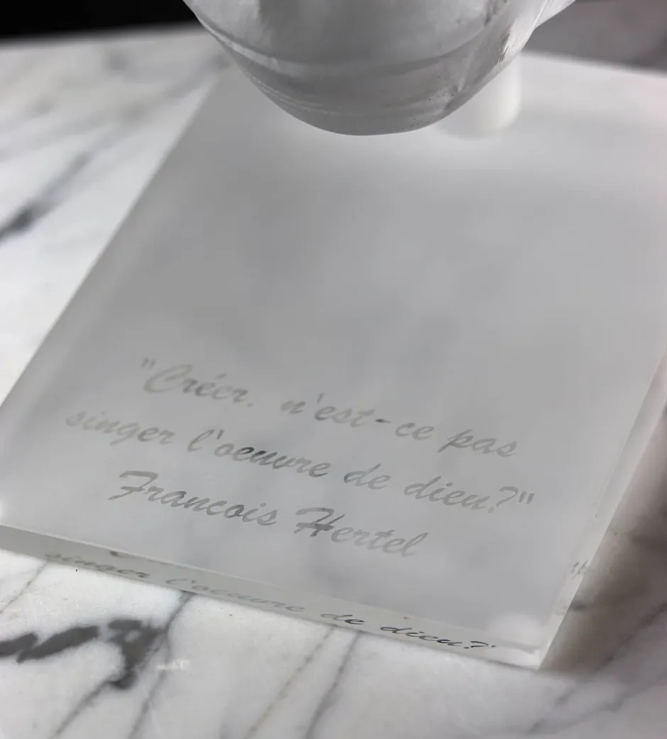 Fabriquée à Baccarat par Loïc Ortega, cette œuvre d’art sort tout droit d’une moule en plâtre réfractaire que l’on casse après 50 heures de cuisson.