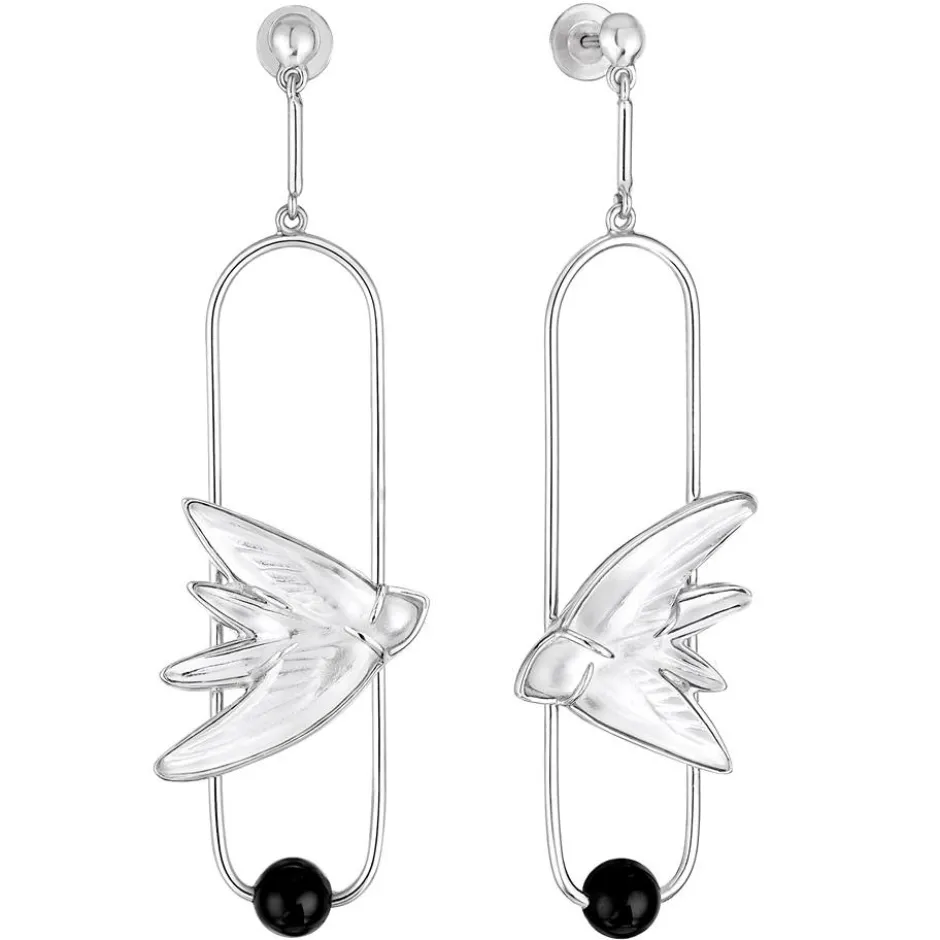 Boucles d’oreilles en cristal, argent, onyx. Les hirondelles sont les messagères du bonheur. Motif très utilisé dans l’oeuvre de René Lalique, son élégance et sa beauté ont fait tout son succès. Nouveauté 2018. Découvrir la collection Hirondelles.