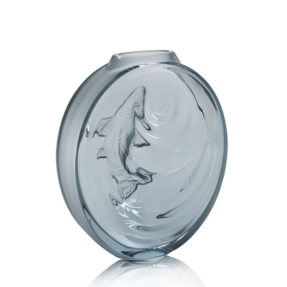 A travers le mouvement de l’onde animant la face avant du vase, une carpe Koï, sculptée en intaille sur la face arrière, semble remonter à la surface de ce lac de cristal. Répondant à la géométrie des lignes, la pureté du cristal incolore, vert menthe ou bleu Persépolis, délivre ici toute sa lumière.