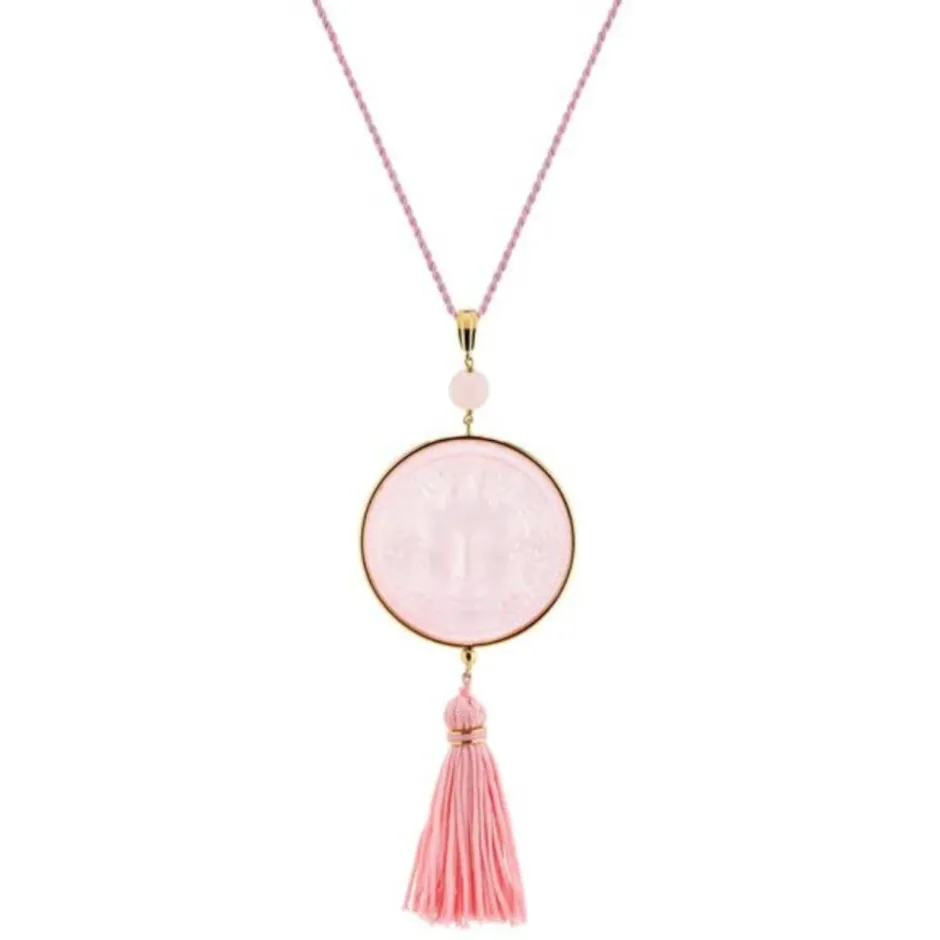 Pompon et cordon tissés en soie artificielle, de couleur assortie. Le cordon à nouer permet d’ajuster la longueur du porté selon ses envies. Une laque est délicatement appliquée à la main par les artisans bijoutiers pour souligner des éléments de métal extrêmement fins.