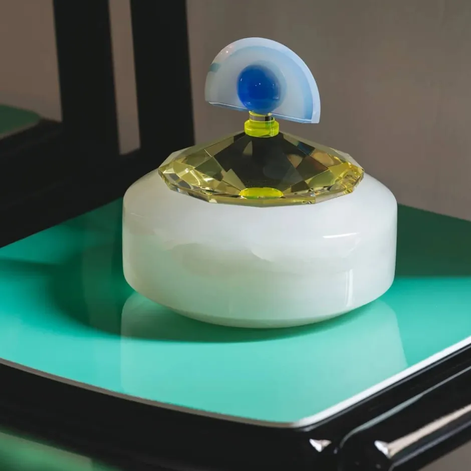 Confectionnée en onyx blanc rare et en cristal éclatant aux nuances jaunes et bleues, la Bonbonnière Myrtille allie élégance et art. Un cercle de cristal bleu, infusé dans du cristal transparent à son sommet, incarne l’essence même de la myrtille, tandis que les facettes du couvercle créent des reflets complexes, tels un soleil chaud, sublimés par des nuances dorées. Récipient raffiné pour petits trésors, cette bonbonnière est un cadeau idéal ou un ajout raffiné à toute collection.