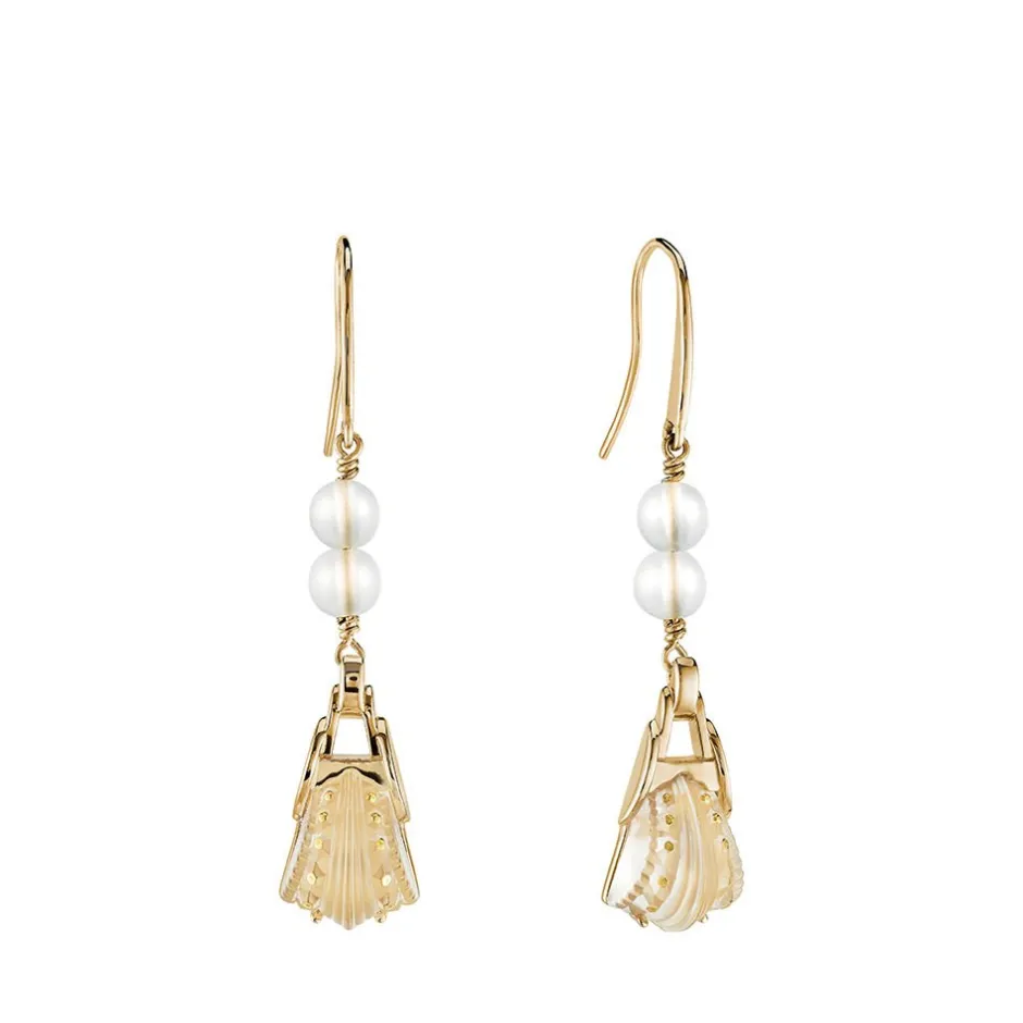 Boucles d’oreilles composées de perles de verre incolore et d’un cristal incolore sur vermeil avec des points d’émail doré. Système dormeuse. Collection 2016. Découvrir la Collection Icône Lalique.
