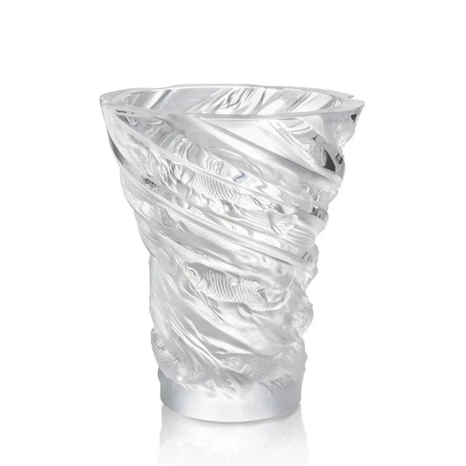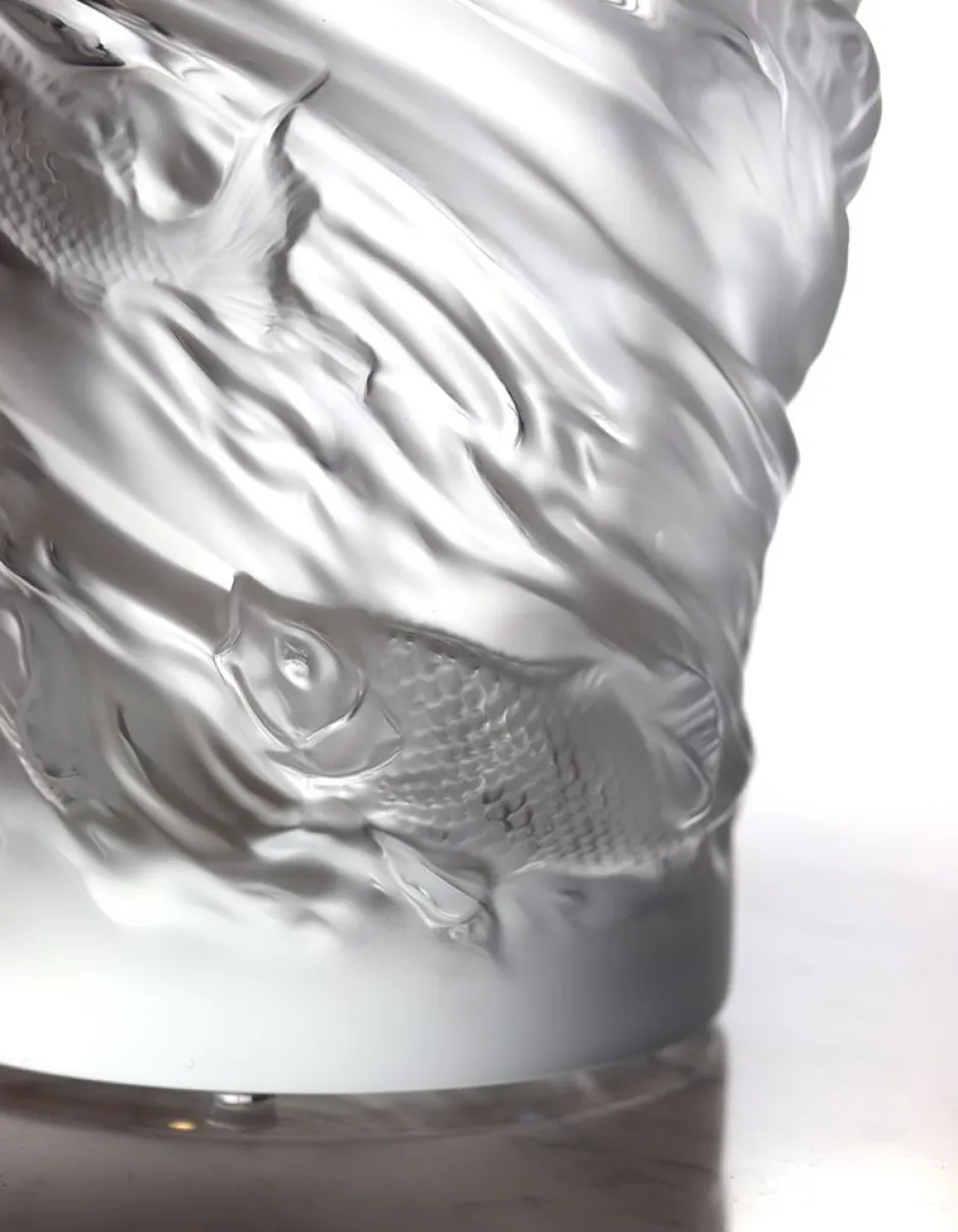 Très prisées en Asie, les carpes Koï représentent la richesse, la virilité, la longévité et la persévérance. Ce symbolisme prend notamment sa source dans une légende chinoise : après avoir remonté le Fleuve Jaune à contre-courant et réussi à passer la cascade du Dragon, une carpe courageuse se serait envolée vers le ciel en se transformant en dragon. La carpe est ainsi devenue un symbole de la réussite à travers la persévérance et cette légende reste aujourd’hui célébrée lors des Koinobori, pour souhaiter aux jeunes enfants la réussite scolaire et le succès social. Ce vase Carpes Koï illustre avec majesté cette légende ancestrale à travers douze carpes affrontant le courant d’un tourbillon de cristal satiné et repoli.